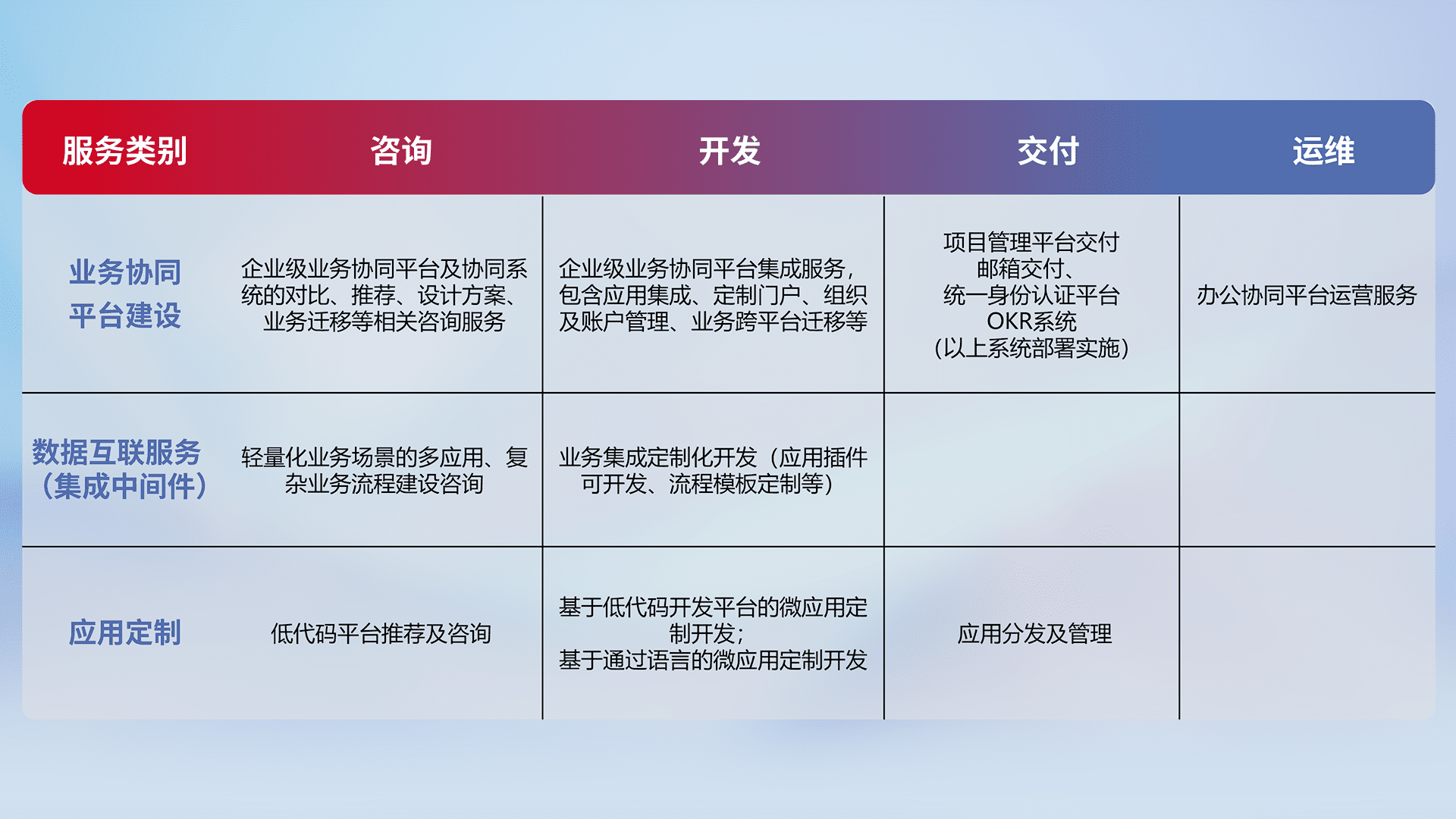 针对钉钉、、企微、、、IDaas等平台级产品提供产品的规划、、、、方案、、交付、、、、定制化开发等服务,,实现如统一协同办公、、智能客户服务、、、混合会议管理、、、智能数据查询、、等业务场景,,实现数字化转型。。